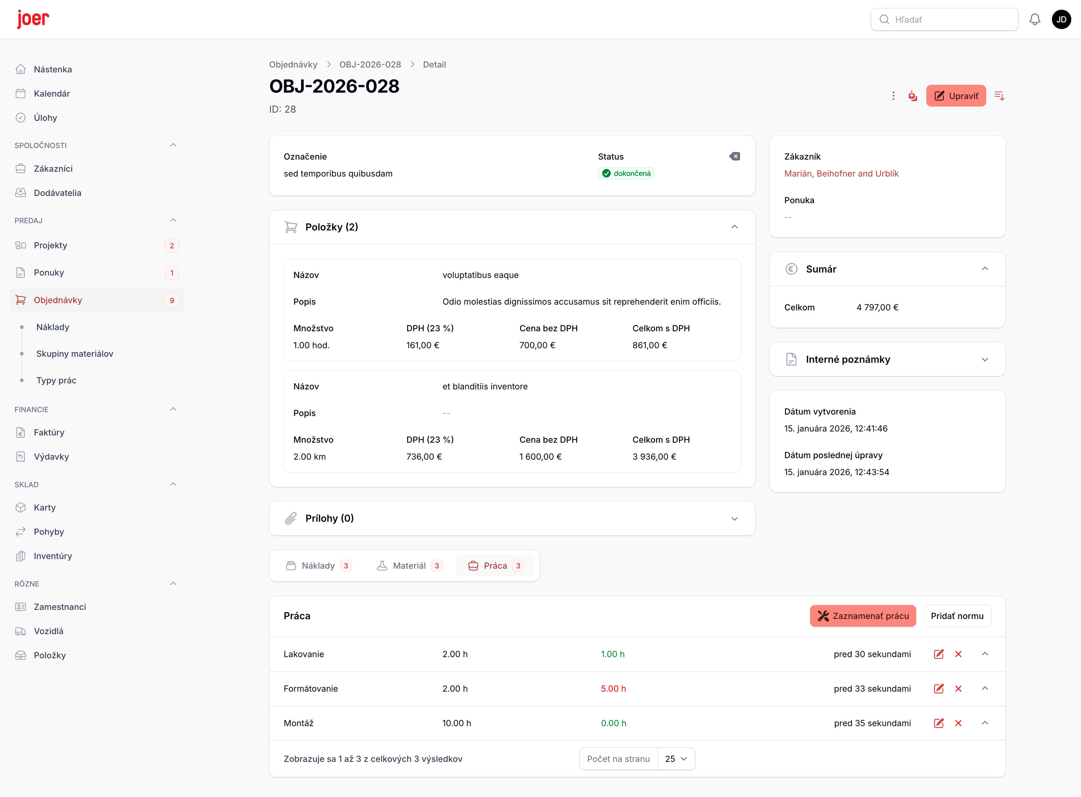 Pre spoločnosť Joer sme vyvinuli interný informačný systém (ERP) na mieru, ktorý digitalizuje celý životný cyklus zákazky – od prvotnej cenovej ponuky až po finálnu fakturáciu. Aplikácia nahrádza viacero izolovaných nástrojov jednou centralizovanou platformou, ktorá umožňuje efektívne riadenie vzťahov so zákazníkmi (CRM), tvorbu kalkulácií a sledovanie nákladovosti projektov v reálnom čase. Kľúčovou súčasťou riešenia je modul pre kapacitné plánovanie v interaktívnom kalendári a presná evidencia odpracovaného času na jednotlivých úlohách (lakovanie, montáž, formátovanie). Systém poskytuje manažmentu detailný prehľad o ziskovosti zákaziek a vyťaženosti zamestnancov, čím výrazne zefektívňuje administratívne a výrobné procesy.